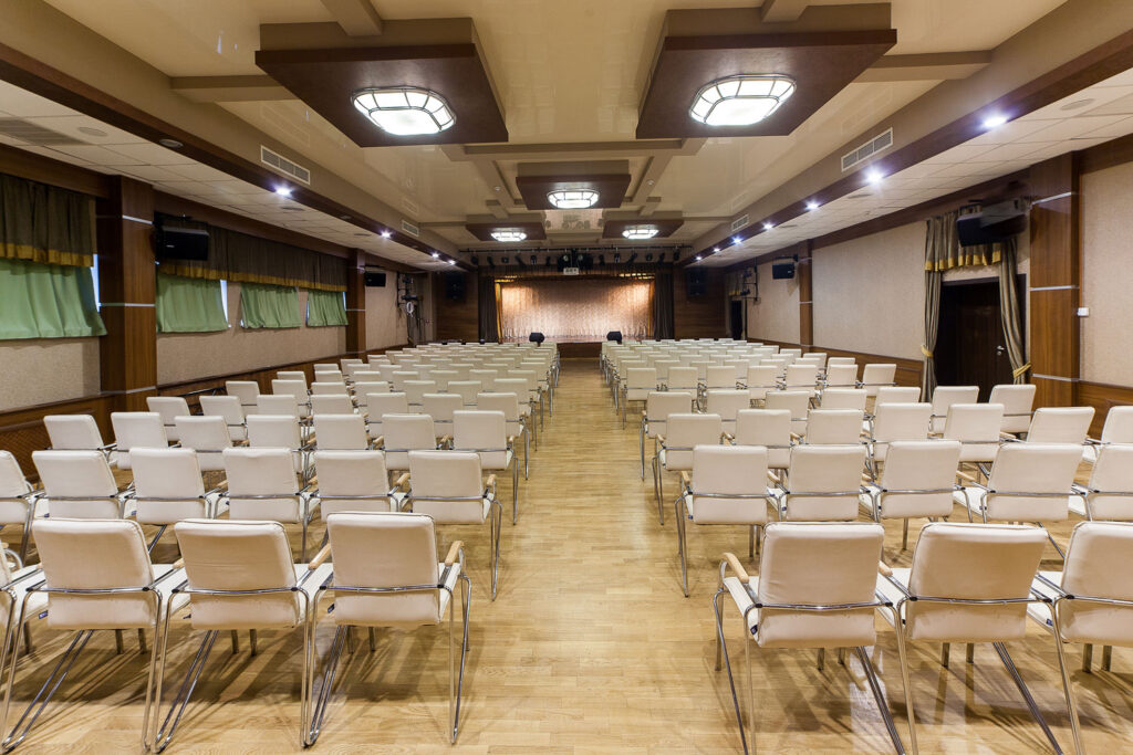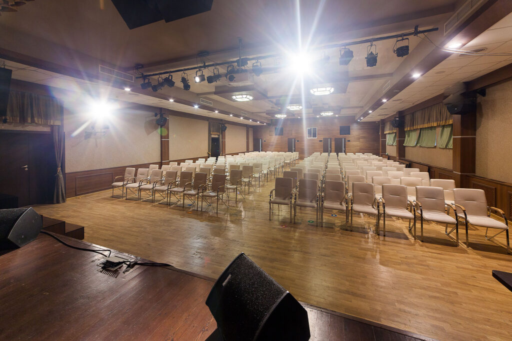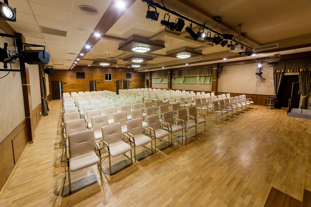Добре освітлений, просторий, обладнаний потужним кондиціонером зал. Наразі діє обмеження на кількість присутніх у 100 осіб. Гості почуватимуться затишно та невимушено, з комфортом розташувавшись на зручних сучасних стільцях. Оренда актового залу у Харкові – правильне рішення для тих, хто хоче провести урочистий захід, організований на найвищому рівні. Підготовлені співробітники «Бейт Дан» сприятимуть у його проведенні, щоб у запрошених гостей залишилися лише найкращі враження та бажання повернутися сюди знову.